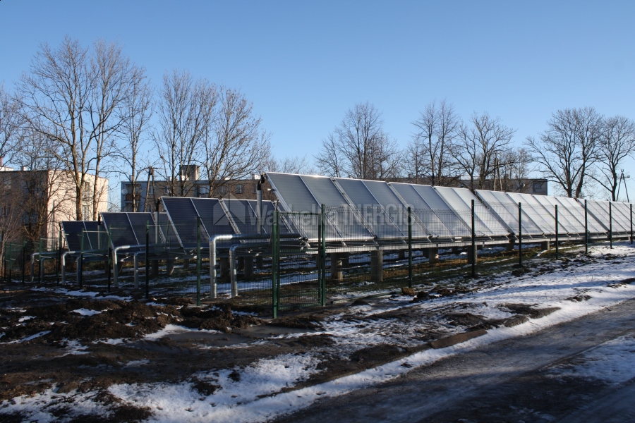 - building of a solar installation, whose composition encompassed 48 solar collectors of an active surface area of 235.68m2, fixed on detached bearing constructions, two buffering tanks, as well as Control and Measurement Instruments and Automation installation and electrical installations,
