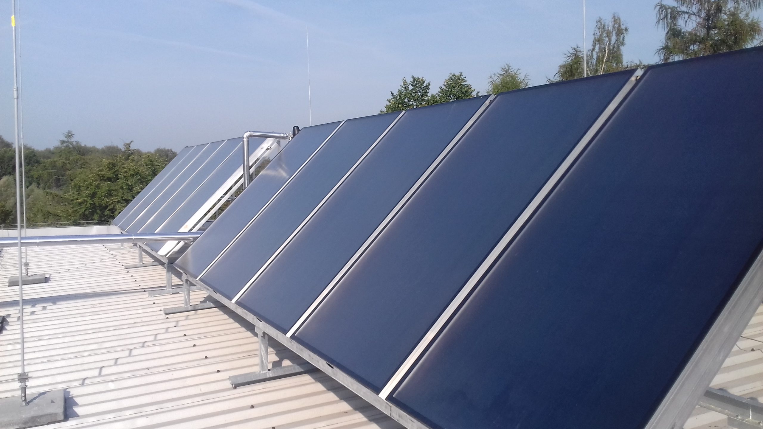 – montaż 28 sztuk kolektorów słonecznych o całkowitej powierzchni absorpcyjnej 74,20 m2 na konstrukcjach wsporczych na dachu budynku